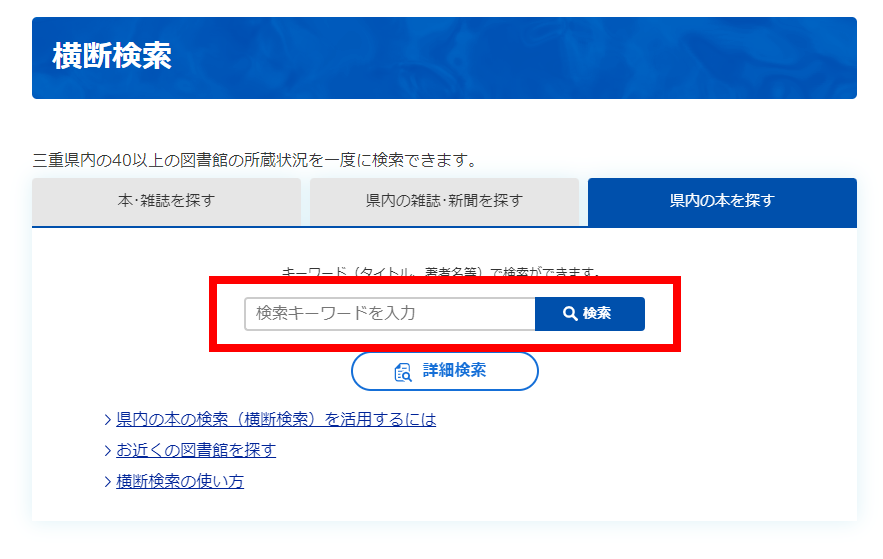- 三重県立図書館 横断検索の検索欄(下図の赤枠参照)に書名や作者などのキーワードを入力して資料を検索し、検索結果一覧から所蔵している図書館を確認します。